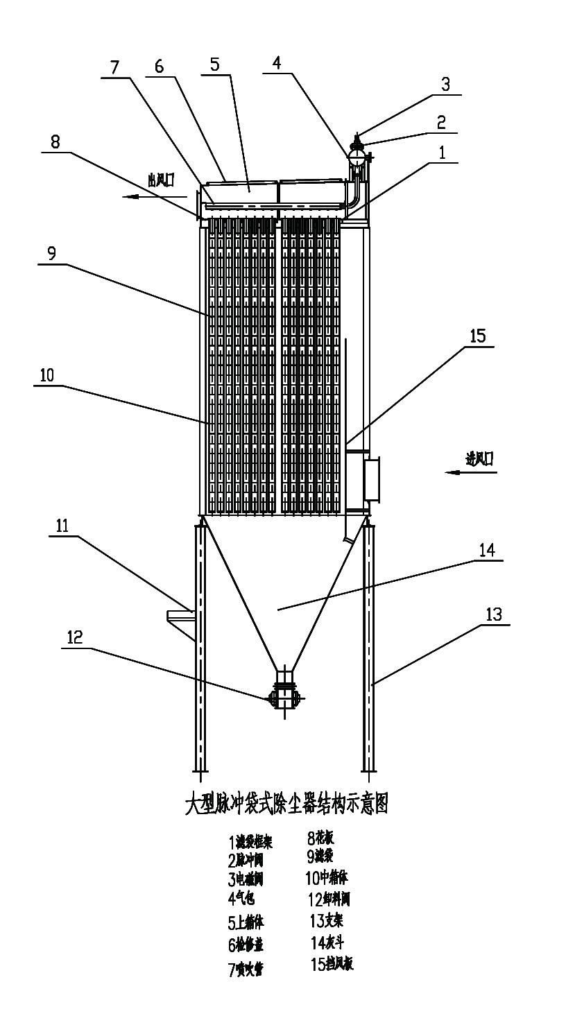 CD長袋脈沖袋式除塵器的主體結(jié)構(gòu)由上箱體、中箱體、袋室、灰斗、卸灰裝置、噴吹裝置、和控制儀幾大部分組成。并配有基礎(chǔ)支柱、爬梯、欄桿、檢修門等等,并可根據(jù)用戶要求選配先進(jìn)的設(shè)備運(yùn)行監(jiān)測系統(tǒng)。